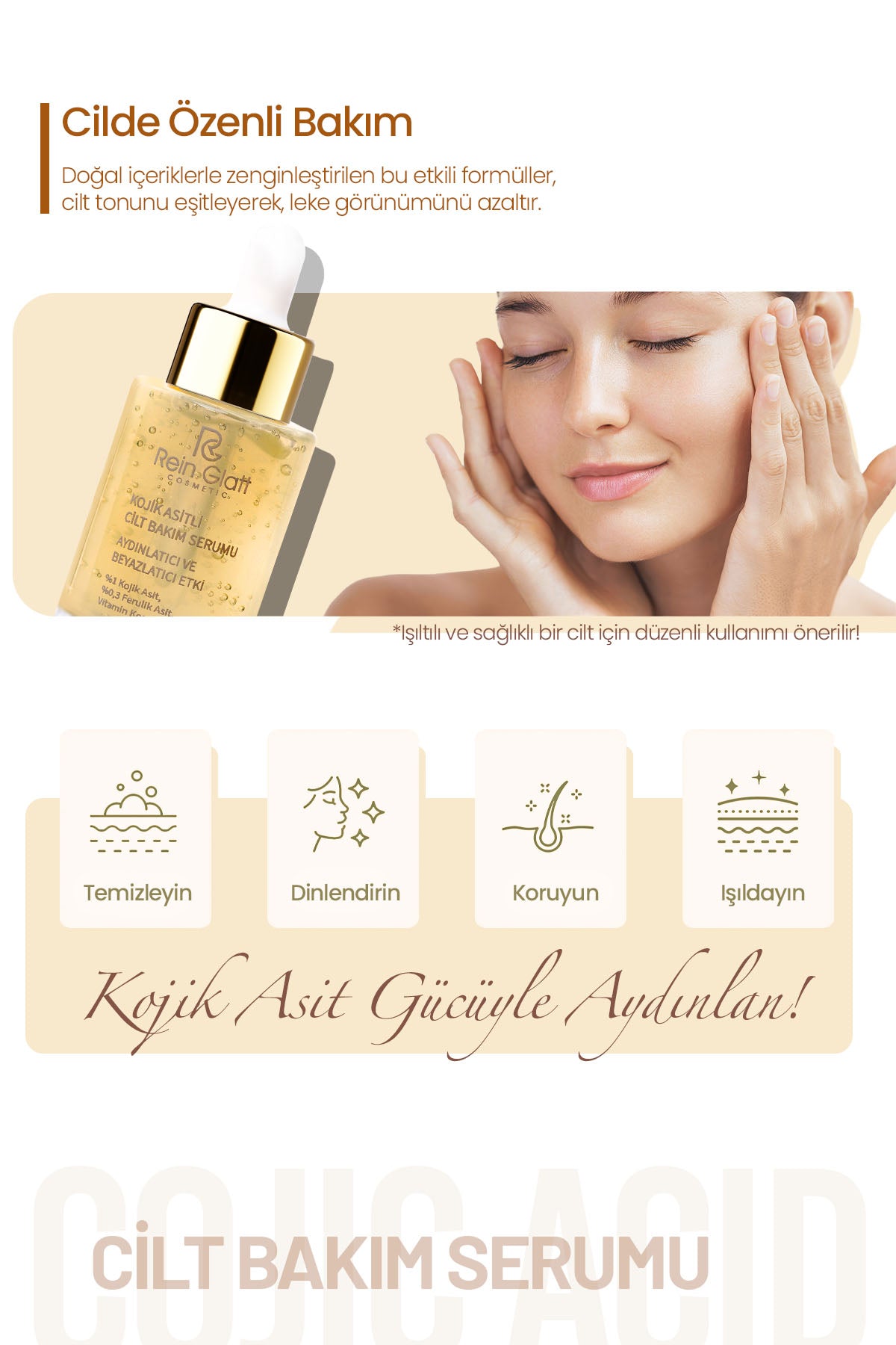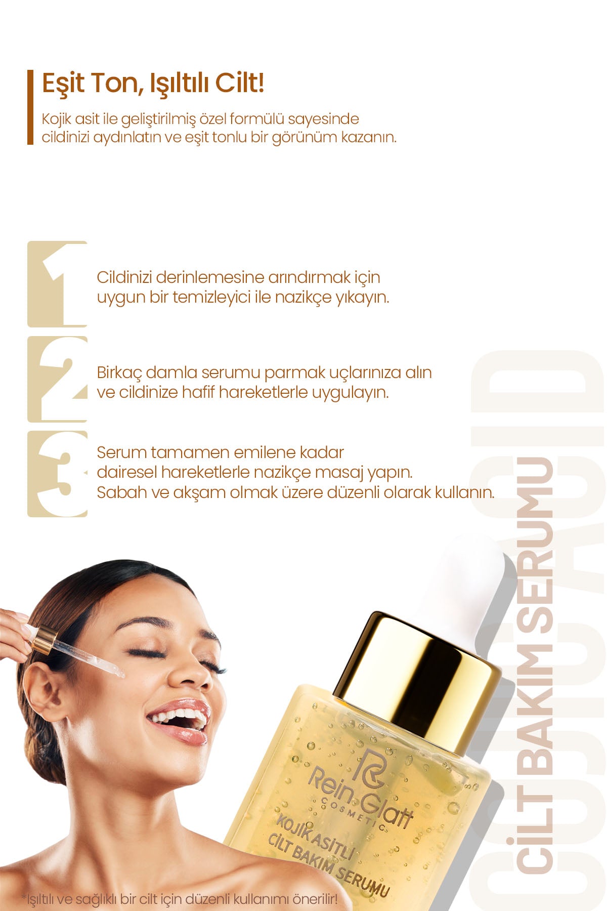 Rein Glatt Cosmetic Kojic Asit Serum ile cildinize dikkat çekici bir aydınlık ve canlılık katın. Her zaman en iyi sonuç için düzenli bakım yapmayı unutmayın